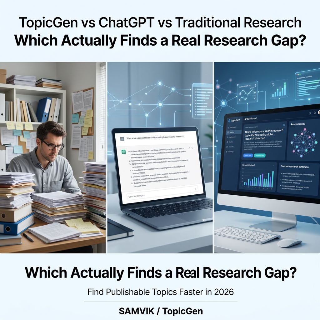 Today you actually have choices. You can dig through papers the old-fashioned way. You can ask ChatGPT for ideas. Or you can use a purpose-built tool like SAMVIK AI TopicGen, which was designed for one thing — finding an original, gap-backed research topic quickly. The question is which of these actually works when a PhD or Masters scholar is sitting in front of a blank page trying to finalise a topic their supervisor will approve.